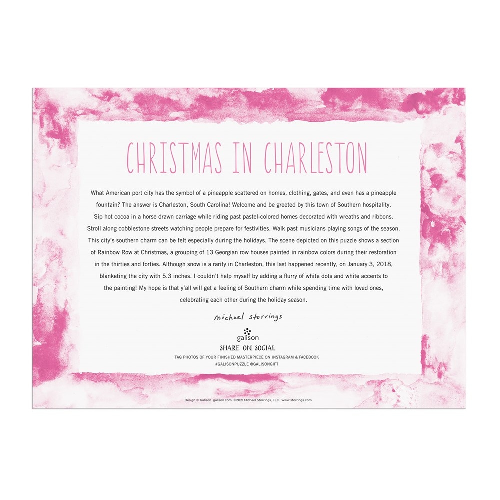 Le designer, illustrateur et directeur créatif primé Michael Storrings capture l'esprit de Noël à Charleston avec le puzzle Michael Storrings Christmas in Charleston de 1 000 pièces. Les puzzles Galison sont emballés dans des boîtes robustes au fini mat, parfaites pour offrir, réutiliser et ranger. Un insert de l'image complète du puzzle est également inclus. • 1 000 pièces, coupées en ruban • Boîte : 11,25 x 8,25 x 2", 286 x 210 x 51 mm • Taille du puzzle : 27 x 20", 686 x 508 mm • Comprend un insert de puzzle • Le tableau gris Puzzle contient 90 % de papier recyclé. L'emballage contient 70 % de papier recyclé et est fabriqué de manière responsable à partir de matériaux certifiés FSC. Imprimé avec des encres non toxiques