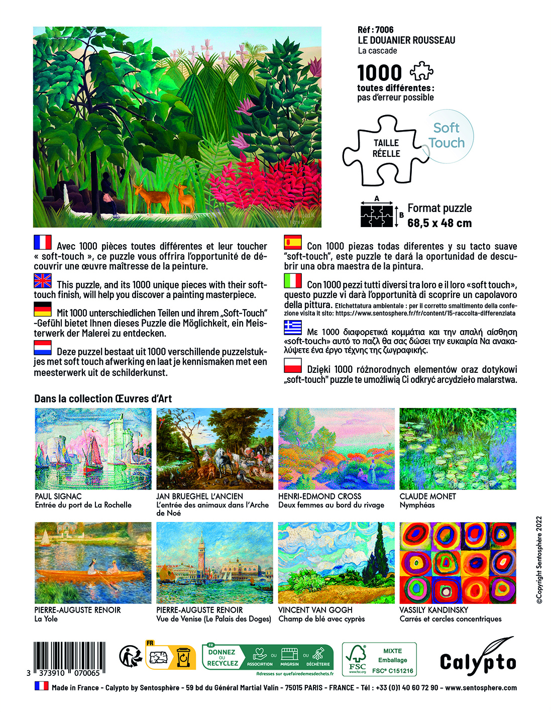 Avec 1000 pièces toutes différentes, une qualité d’impression issue des dernières technologies permettant d’obtenir de nouvelles couleurs, en particulier au niveau des bleus et des verts, un toucher soyeux, des boîtes plus compactes et une fabrication Française, pour limiter l’empreinte carbone, la gamme Calypto propose un véritable renouveau dans le monde des puzzles.