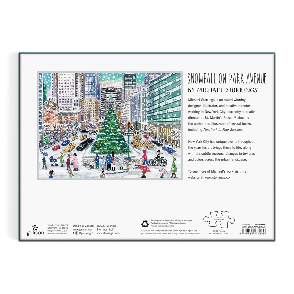 Le designer, illustrateur et directeur créatif primé Michael Storrings met en lumière l'expérience hivernale ultime à New York avec de la neige, un sapin de Noël illuminé et des acheteurs de Noël dans Michael Storrings Snowfall on Park Avenue 1000 Piece Puzzle. Les puzzles Galison sont emballés dans des boîtes robustes au fini mat, parfaites pour offrir, réutiliser et ranger. Un insert de l'image complète du puzzle est également inclus. • 1 000 pièces, coupées en ruban • Boîte : 11,25 x 8,25 x 2", 286 x 210 x 51 mm • Taille du puzzle : 27 x 20", 686 x 508 mm • Comprend un insert de puzzle • Le tableau gris Puzzle contient 90 % de papier recyclé. L'emballage contient 70 % de papier recyclé et est fabriqué de manière responsable à partir de matériaux certifiés FSC. Imprimé avec des encres non toxiques