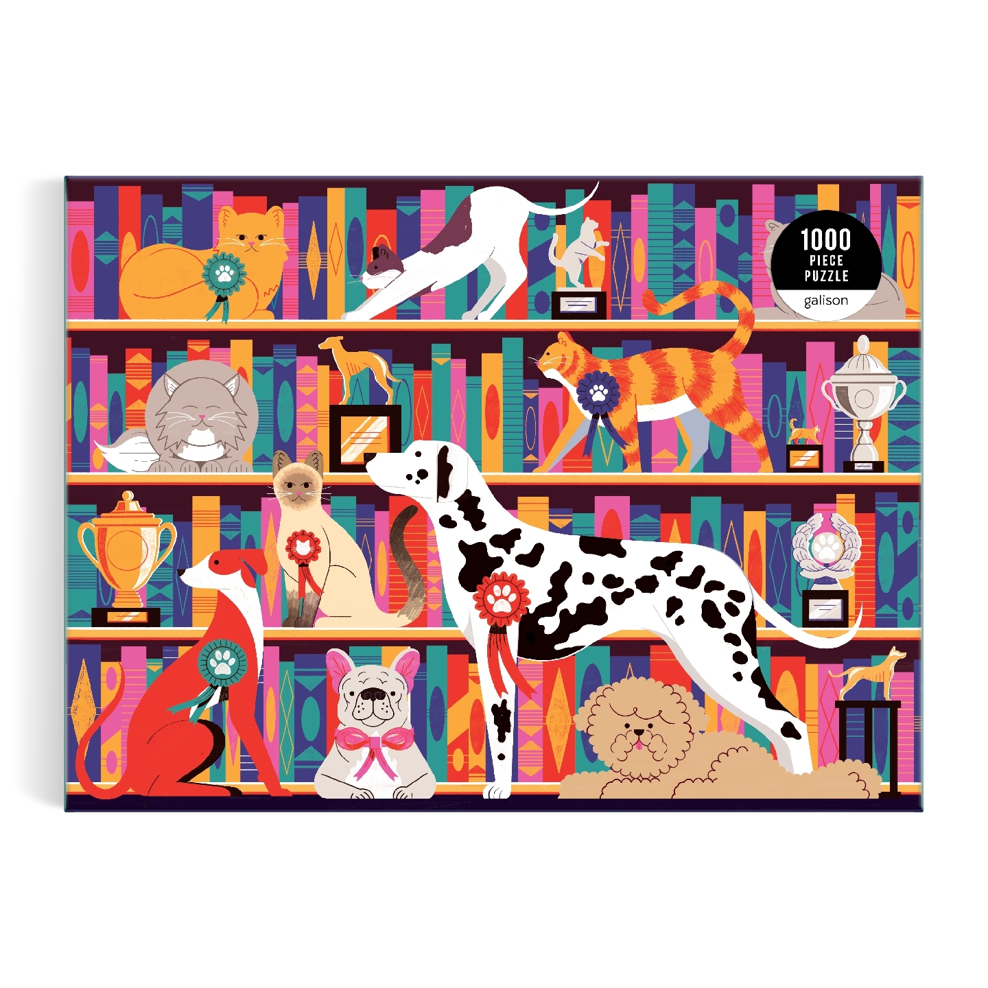 Best in Show est une étagère pleine d'esprit composée de félins Best in Show, de chiens partageant un espace d'étagère avec des trophées et des livres.