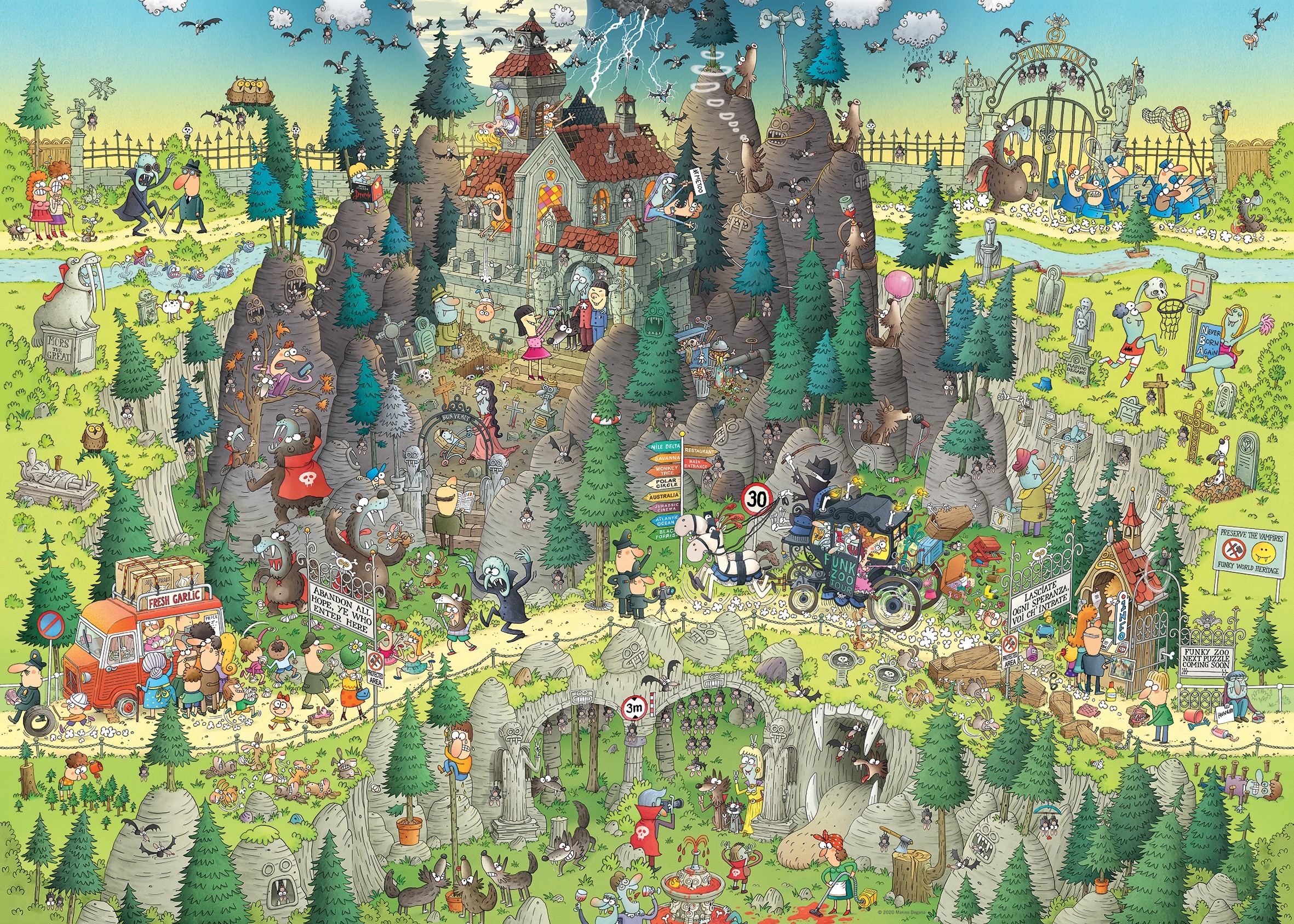 Puzzle 1000 pièces. Transylvanian Habitat de la marque HEYE, de la série Funky Zoo et de l'artiste Marino Degano - Dimensions du puzzle monté : 50 cm x 70 cm - Label FSC (ce label environnemental a pour but d'assurer que la production de bois ou d'un produit à base de bois respecte les procédures garantissant la gestion durable des forêts)